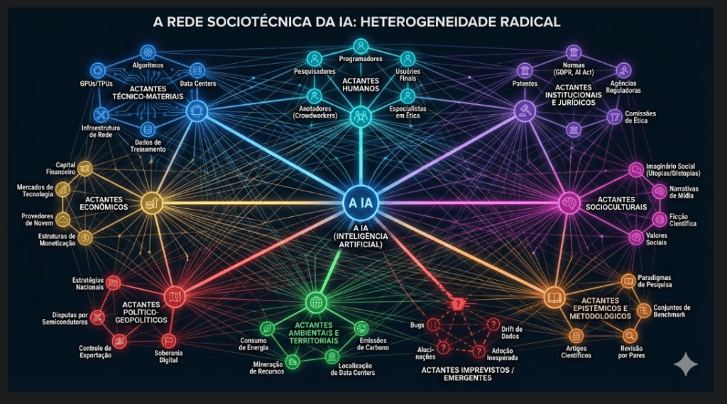 À luz da Teoria Ator-Rede, a ação nunca é puramente humana. Ela emerge de uma rede de elementos heterogêneos — pessoas, dispositivos, regras, interfaces, dados. Assim como no futebol o gol não é “feito” só pelo jogador (mas por bola, campo, regra, árbitro, chuteira, VAR, torcida), o texto produzido com IA é resultado de uma composição: